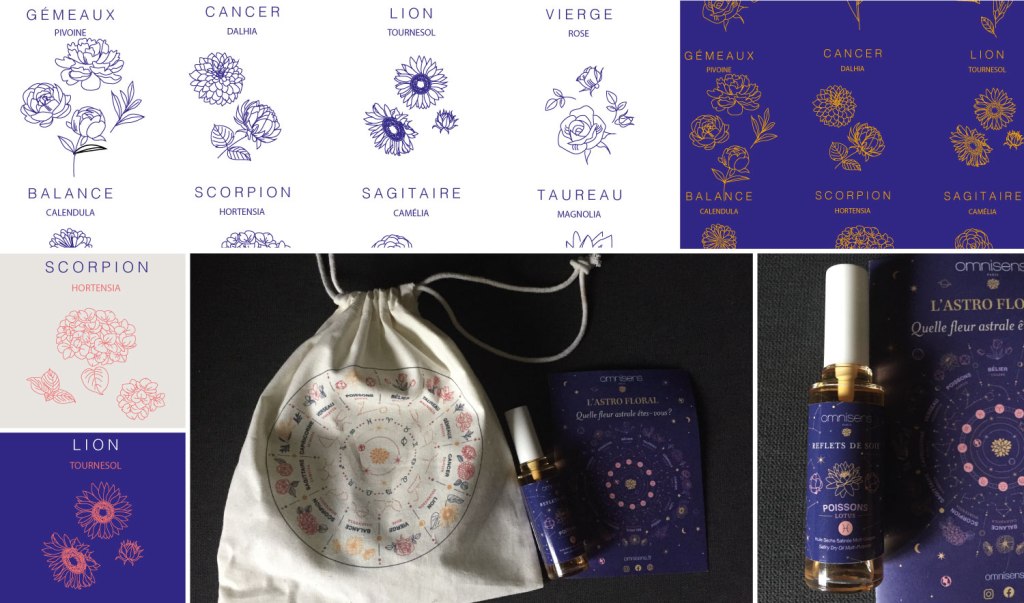 Les fleurs ont été arrangées et intégrées à une roue représentant tous les signes par l’équipe marketing d’Omnisens pour illustrer une série spéciale et un joli sac à offrir pour Noël